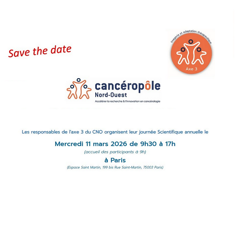 Les responsables de l'axe 3 du cancéropôle Nord-Ouest (CNO) organisent leur journée scientifique annuelle le mercredi 11 mars 2026 de 9h30 à 17h10 (accueil des participants à 9h) à l'Espace Saint Martin (Paris).