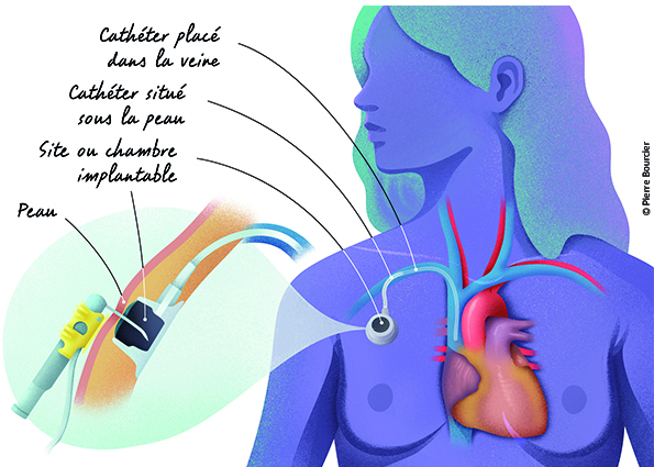 Aussi, avant de commencer le traitement par perfusion, dit intraveineux, la pose d’une chambre implantable percutanée (CIP) est recommandée. Elle est même indispensable avec certains produits.