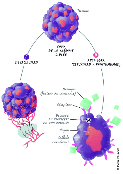 Le médicament de thérapie ciblée alors utilisé est le bevacizumab. Il fait partie de la famille des anticorps monoclonaux qui agissent contre l’angiogenèse, c’est-à-dire contre la formation de nouveaux vaisseaux sanguins par la tumeur. On dit que c’est un médicament antiangiogénique.