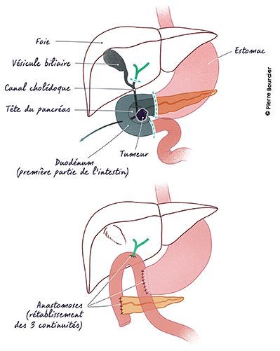 Le chirurgien enlève d’abord la tête du pancréas sur laquelle est située la tumeur. La tête du pancréas étant reliée au duodénum, cette partie de l’intestin est également retirée. Comme la voie biliaire traverse la tête du pancréas, le canal cholédoque et la vésicule biliaire sont également retirés. La région de l’estomac située à proximité du duodénum (le pylore) est généralement enlevée mais elle peut, dans certains cas, être préservée.