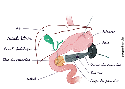 Si la tumeur est localisée au corps ou à la queue du pancréas, le chirurgien effectue une splénopancréatectomie gauche (SPG). Cela consiste à enlever la queue du pancréas.