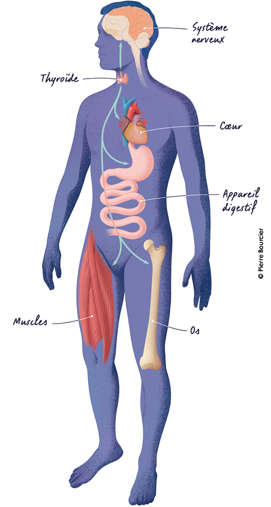 Les hormones thyroïdiennes influent sur de nombreuses fonctions du corps humain. De manière générale, elles contribuent à la production d’énergie, de chaleur, ou encore à l’utilisation des éléments issus de l’alimentation : sucres, graisses, protéines. Elles agissent sur les muscles, le cœur, le tube digestif, les cheveux... Chez l’enfant, elles participent à la croissance et au développement du système nerveux. À l’âge adulte, elles contribuent au fonctionnement du système nerveux et à l’entretien des os.