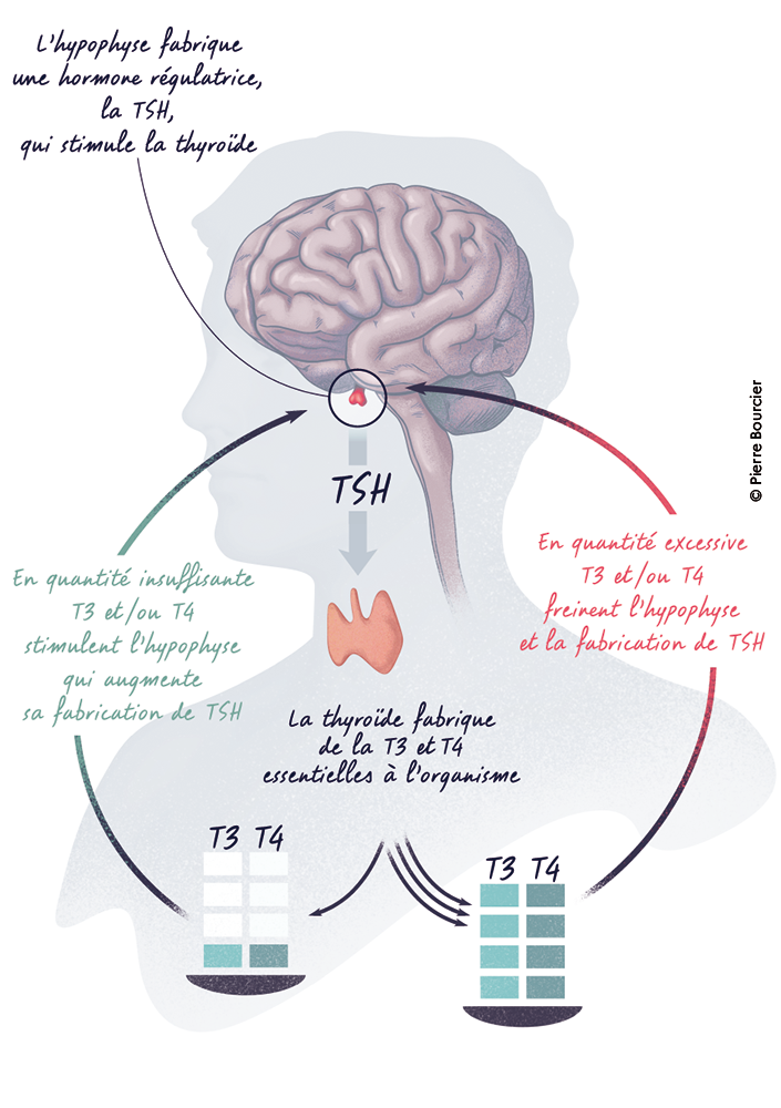 L’hypophyse est informée, en temps réel, de la quantité d’hormones thyroïdiennes qui circulent dans le corps. Elle ajuste alors son action en augmentant ou diminuant la production de TSH. La régulation de l’activité de la thyroïde fonctionne ainsi selon une boucle entre la thyroïde et l’hypophyse qui interagissent en fonction des besoins du corps.